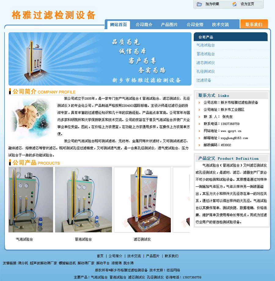 我公司成立于2005年,是一家專門生產氣泡試驗臺(冒泡試驗臺、濾芯測試儀)的專業化公司,產品制造嚴格按照ISO4003國際標準。主設計師是過濾行業的資深專家,具有豐富的過濾理論知識和幾十年的實踐經驗。產品起點非常高。公司常年與國內多家科研院所和大學保持聯系和技術交流。公司的宗旨在于普及氣泡試驗臺并使廣大企事業單位受益。因此,在價格上力求便宜,在功能上力求通用多樣,在操作上力求簡單方便。